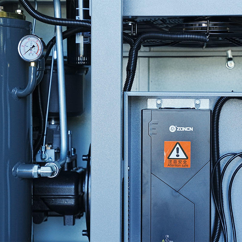 Il compressore monostadio bivite microolio da 30 HP incorpora un motore sincrono a magnete permanente con protezione dal basso aumento di temperatura e un sistema di controllo della conversione di frequenza, che influenzano entrambi le caratteristiche di vibrazione. L'interazione diretta ed efficiente tra il motore e il rotore a vite garantisce una trasmissione regolare della coppia riducendo al contempo le oscillazioni meccaniche durante l'avvio, il funzionamento o la decelerazione. Inoltre, la tecnologia di conversione della frequenza consente alla macchina di accelerare e decelerare gradualmente, riducendo al minimo i picchi di coppia improvvisi che possono causare vibrazioni indesiderate. Il sistema di lubrificazione micro-olio stabilizza ulteriormente i componenti interni riducendo l'attrito tra le parti in movimento. Di conseguenza, sebbene in determinati ambienti possano ancora essere necessarie strutture esterne per l’assorbimento delle vibrazioni, l’architettura interna del compressore fornisce già le basi per un funzionamento equilibrato e costante.